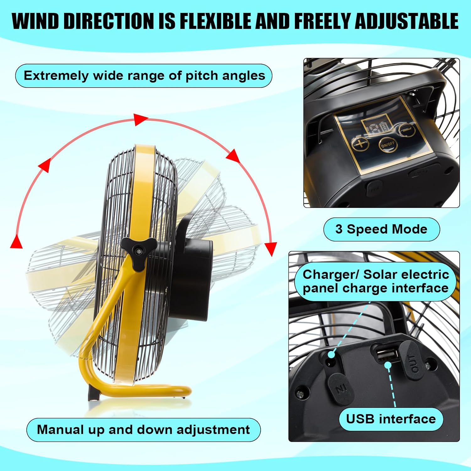 : Yellow 14" Portable Solar Fan, USB Phone-Computer Charge, 12 W Solar Panel, Quiet, Cordless, Long Runtime ... Cuba Home Delivery Included, trackable.