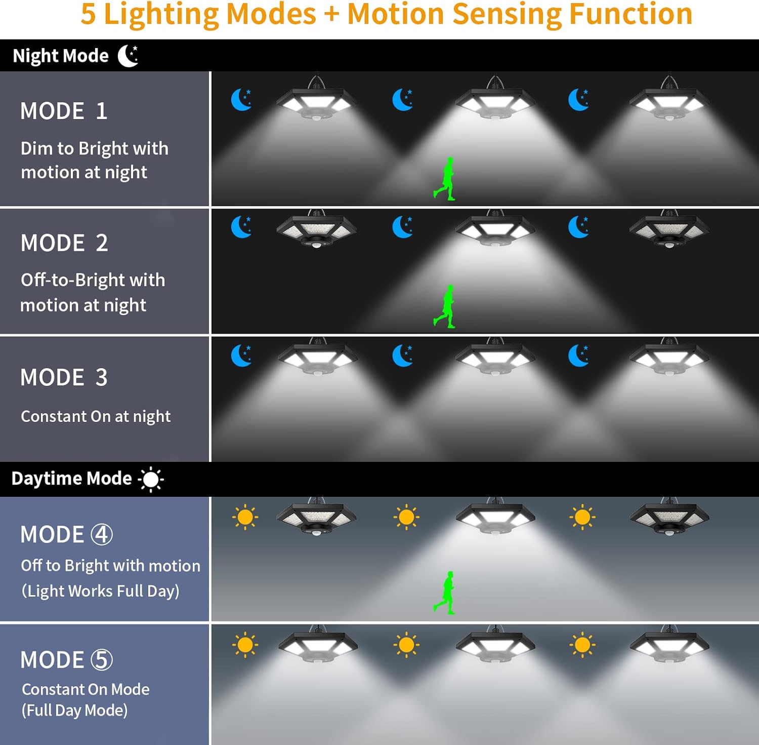 【5 Lighting Modes with Motion Sensor & 3 Timers】This solar shed light has 5 lighting modes: MODE 1: Dim to Bright with motion at night. MODE 2: Off to Bright with motion at night. MODE 3: Constant ON at night. MODE 4: Off to Bright with motion in the Daytime. MODE 5: Always on mode all day. There are also 3 timer settings(2H/4H/6H): Light works full day, you can choose a different time(2H/4H/6H) to meet your needs.