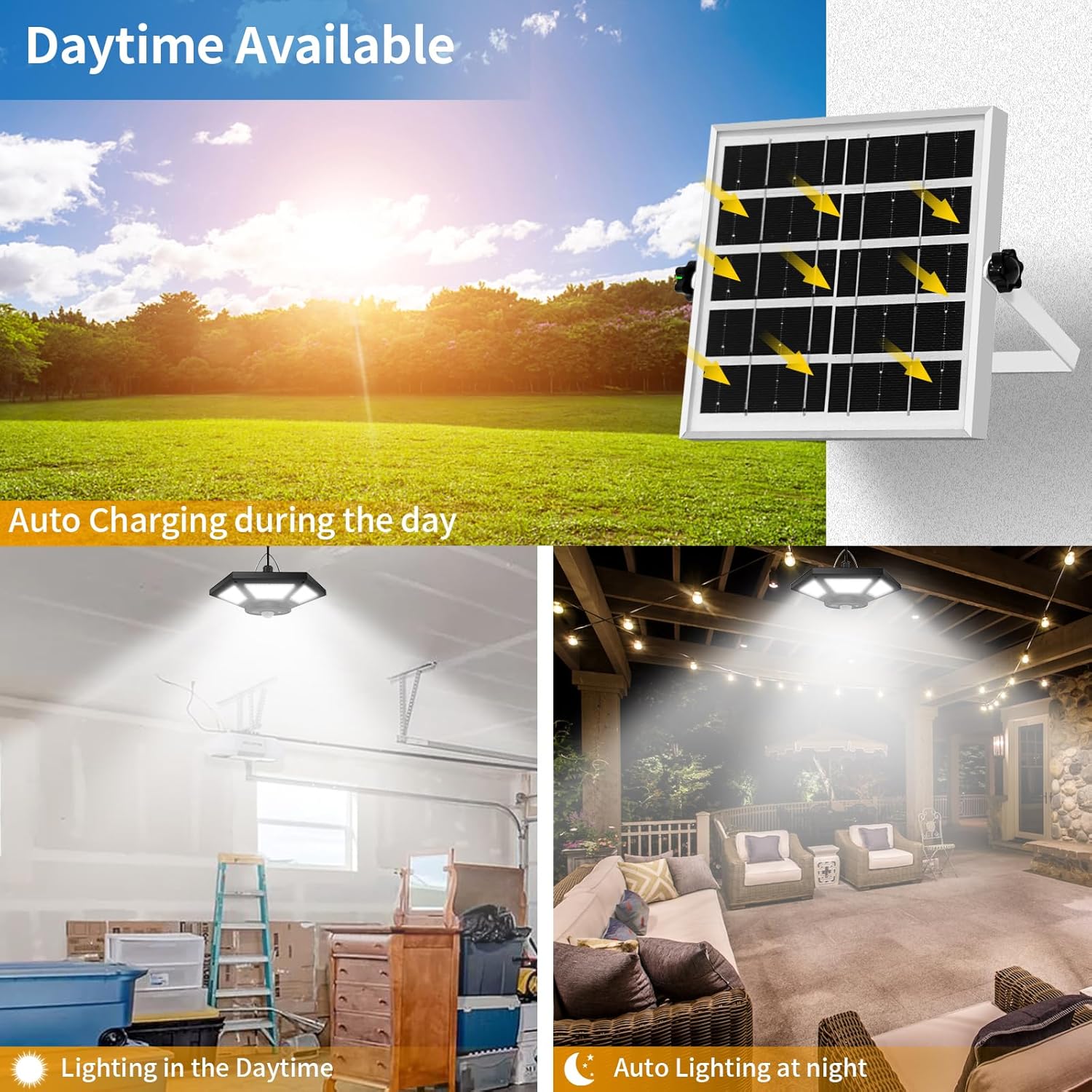【Split Design, Fit for Outdoor & Indoor】The solar indoor lights and solar panel adopted split design with 16.4 FT/5M wire, you can place the solar panel outside and hang the light indoors/outdoors, such as shed, barn, chicken coop, gazebo, garage, home, backyard, basement, garden, yard, patio, hallway, park, porch, corridor, driveway, pathway, front door, deck, tent, van, camp, tools room, storage room, balcony, loft, etc.