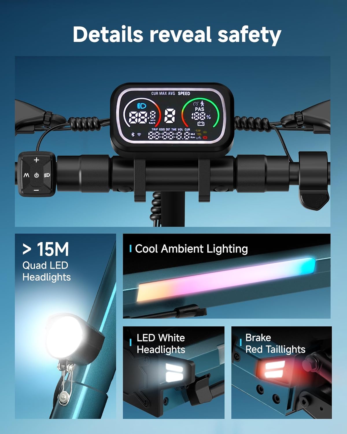 Complete LED Visibility and Safety System Four bright headlights, RGB footboard lighting, and brake-activated alerts keep you highly visible after dark. Ride with confidence, even in low-light urban environments.