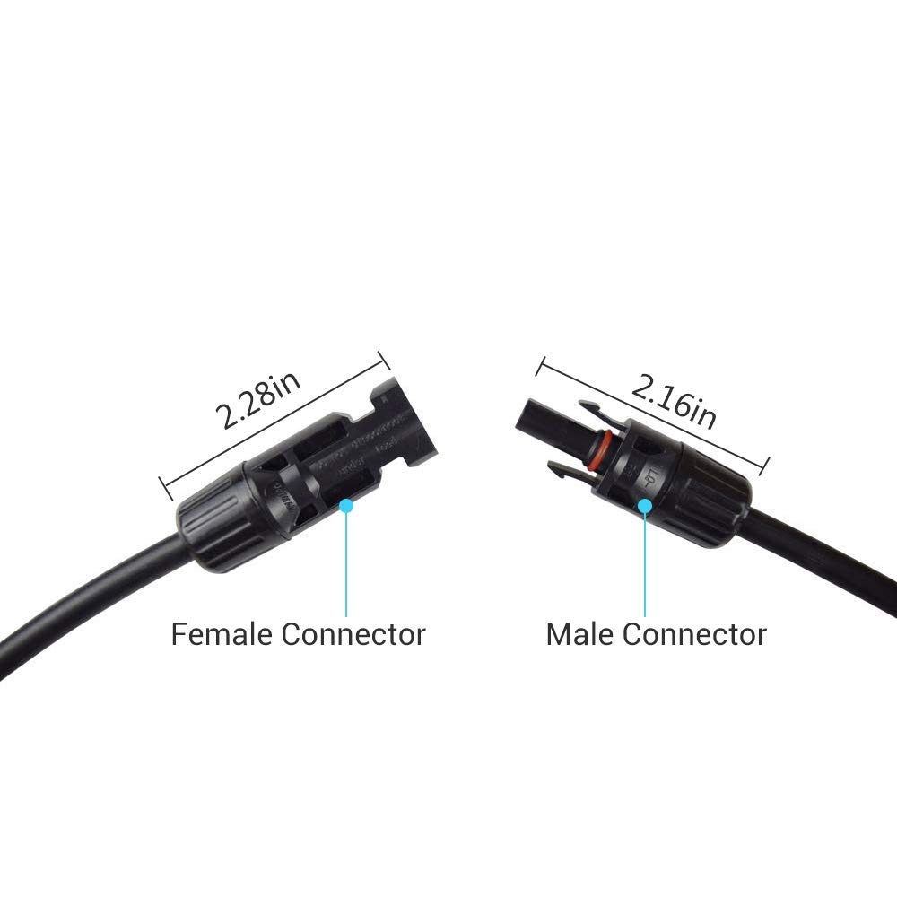 Female and male connectors for an unbreakable connection, hard plastic connectors at each end.Exposed ends for connection to the solar charge controller.Black sunlight-resistant cable. Weatherproof, insulated wiring.Essential for off-grid solar power system setup.Make more space between your solar panels and between your solar panel and the charge controller.Note: There is only one wire in each order