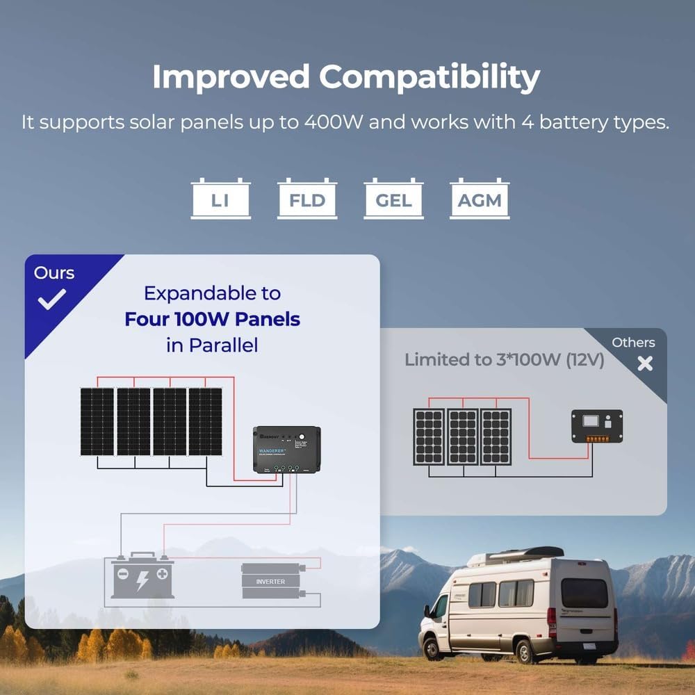 【Efficient Performance】This Starter Kit can generate an average of 500Wh of electricity per day (varies with sunlight). The solar panel boasts a 22.5% cell efficiency, 1.3% higher than other counterparts. Each panel dispatched from our facility undergoes 100% EL testing, ensuring that your panel is completely free from any hidden cracks. 【Market-Leading Service Plan】Enjoy worry-free usage with our market-leading service plan, providing 10 years of coverage for solar panel material and workmanship, along with a 2-year plan for the charge controller. Additionally, benefit from a 25-year service plan for the power output of the panel. 【Exceptional Safety】Certified by UL 61730, CSA C22.2#61730, IEC 61730/IEC 61215, our solar panel withstands 2400Pa wind and 5400Pa snow loads. Featuring IP65-rated J-box and IP67-rated solar connectors, rest assured, it can tackle any weather challenge. 【Remote Monitoring】The Wanderer PWM Charge Controller features an RS232 Bluetooth port. By adding a Renogy BT-1 Bluetooth Module, you can remotely monitor your solar system on the Renogy DC Home app. Keep track of voltage and current at any time, and receive timely warnings for over-voltage, under-voltage, and over-discharge. 【Excellent Compatibility】The solar kit with the Wanderer 30A PWM Charge Controller, supports expansion up to 400W with additional solar panels and is compatible with AGM, Gel, Flooded, and Lithium batteries.