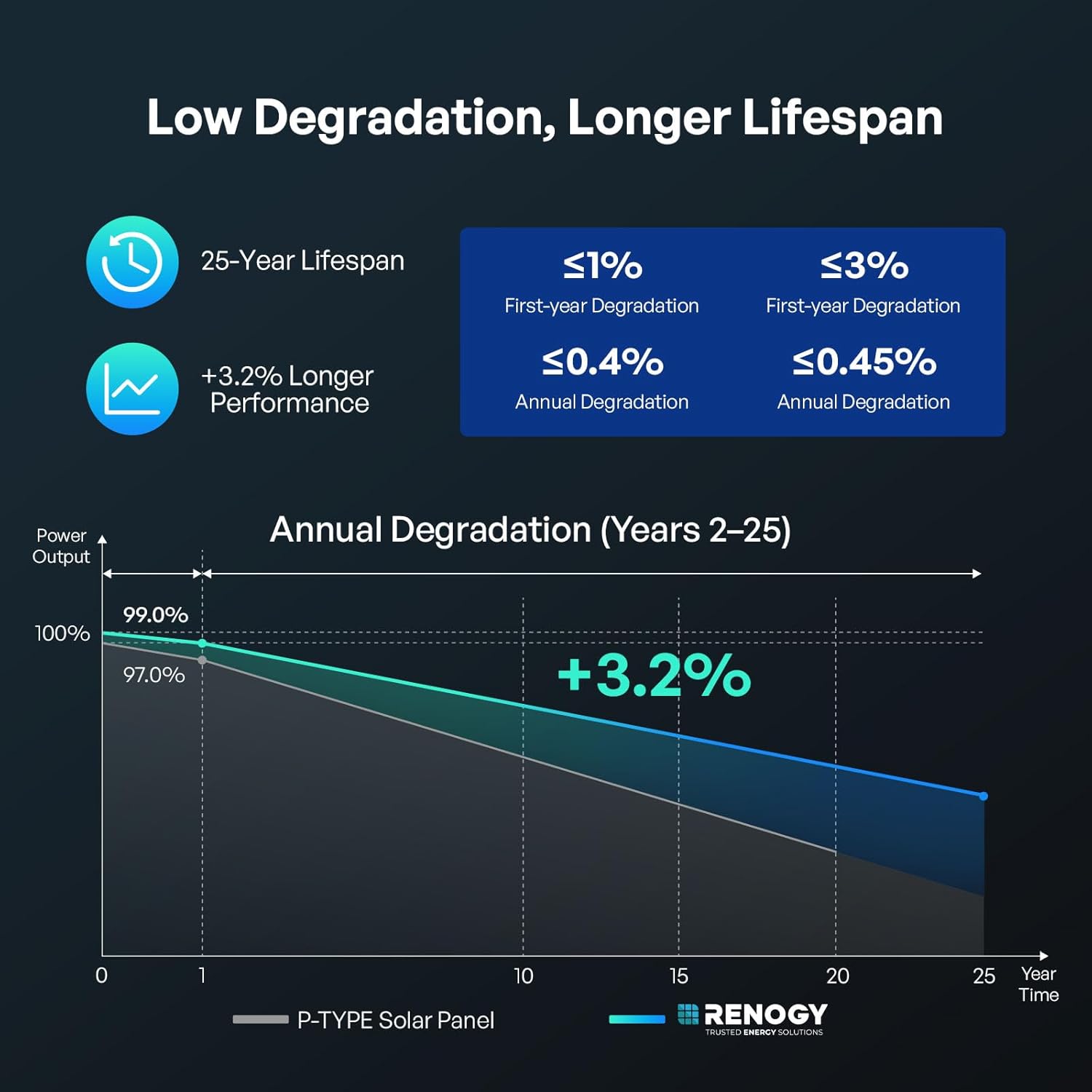 Unmatched Cell Efficiency - Renogy 100w solar panel features grade A+ cells, delivering an impressive conversion efficiency of 25%. This solar panels provide 20W more power output compared to conventional PERC panels of the same design. 16BB for Higher Conversion Efficiency & Longer Lifespan - Utilizing advanced 16BB cell technology, this n-type solar panel enhances photoelectric conversion efficiency while mitigating hot spots and hidden cracks, ensuring a longer service life and superior module performance. Enhanced Performance in High Temperatures - Renogy 100 watt solar panel features a low temperature coefficient, minimizing power loss in high-temperature conditions for superior product performance. The 12v solar panel allows for increased power generation, particularly beneficial in summer months or extremely hot areas. Built to Last - Equipped with IP65 protection, the Renogy N-Type Solar Panel 100W is designed to endure snow, rain, and heat for decades. With low-iron tempered glass and corrosion-resistant aluminum frames, it ensures exceptional performance in all weather conditions. Long-Term Reliability - Renogy solar panels with low degradation (≤1% in the first year, ≤0.4% annually) , plus a 25-year 80% output for lasting performance.