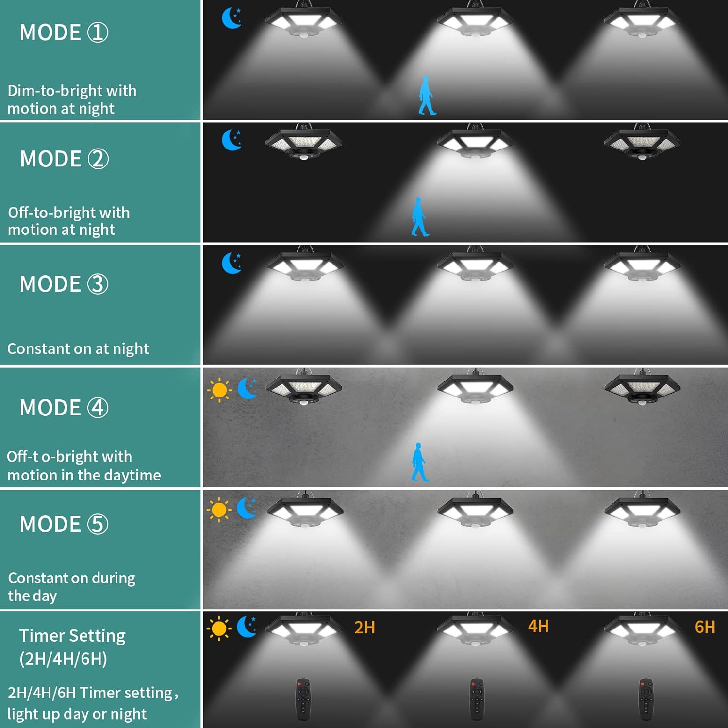 【5 Lighting Modes with Motion Sensor & 3 Timers】This solar shed light has 5 lighting modes: MODE 1: Dim to Bright with motion at night. MODE 2: Off to Bright with motion at night. MODE 3: Constant ON at night. MODE 4: Off to Bright with motion in the Daytime. MODE 5: Always on mode all day. There are also 3 timer settings(2H/4H/6H): Light works full day, you can choose a different time(2H/4H/6H) to meet your needs.