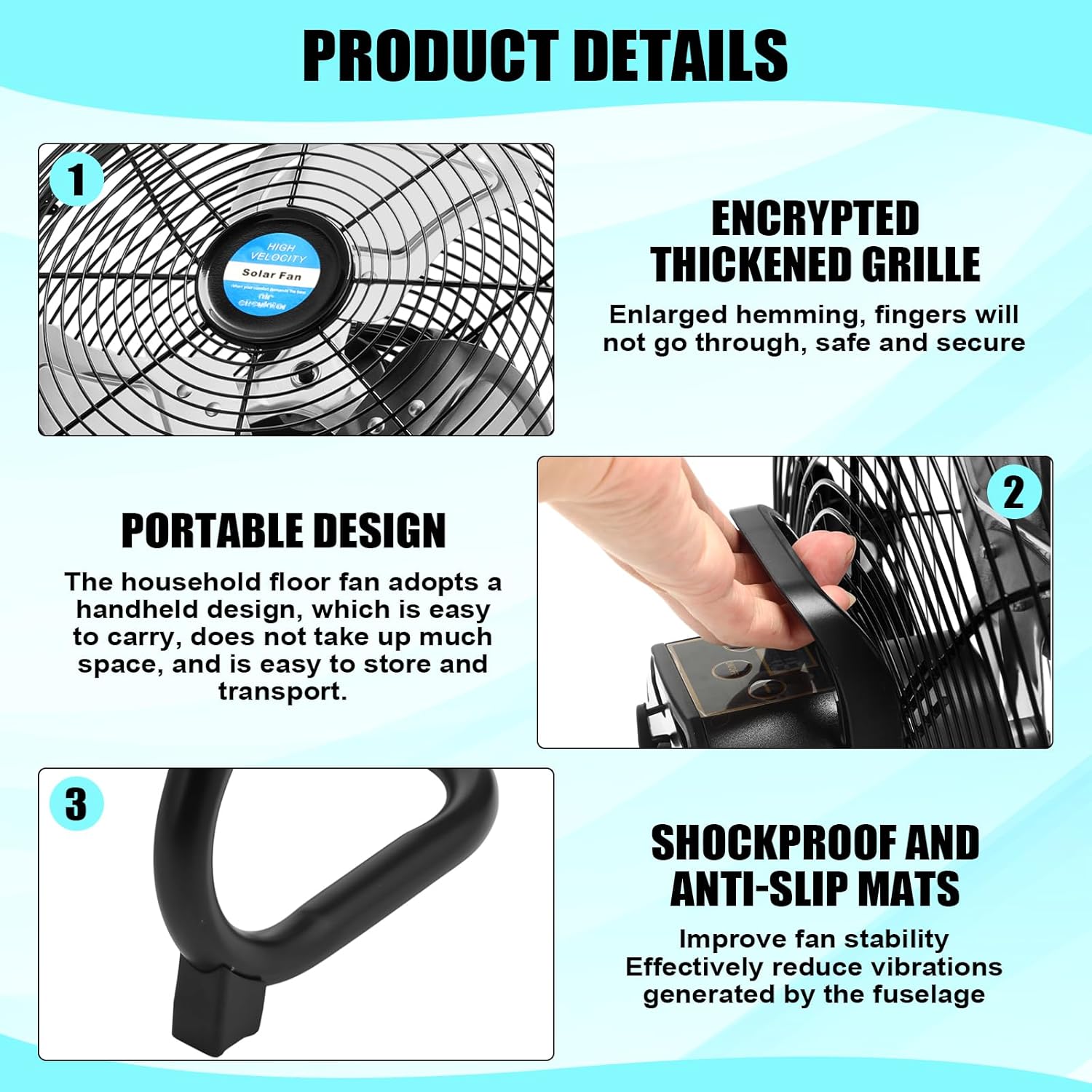 Quality Materials: our rechargeable solar panel fan are made of solid metal and ABS materials, and the solar panels are made of poly silicon, which is sturdy and reliable to ensure your long term use; Both sides of the mini solar panel fan are designed with encrypted and thickened metal protective grilles, which prevent fingers from passing through