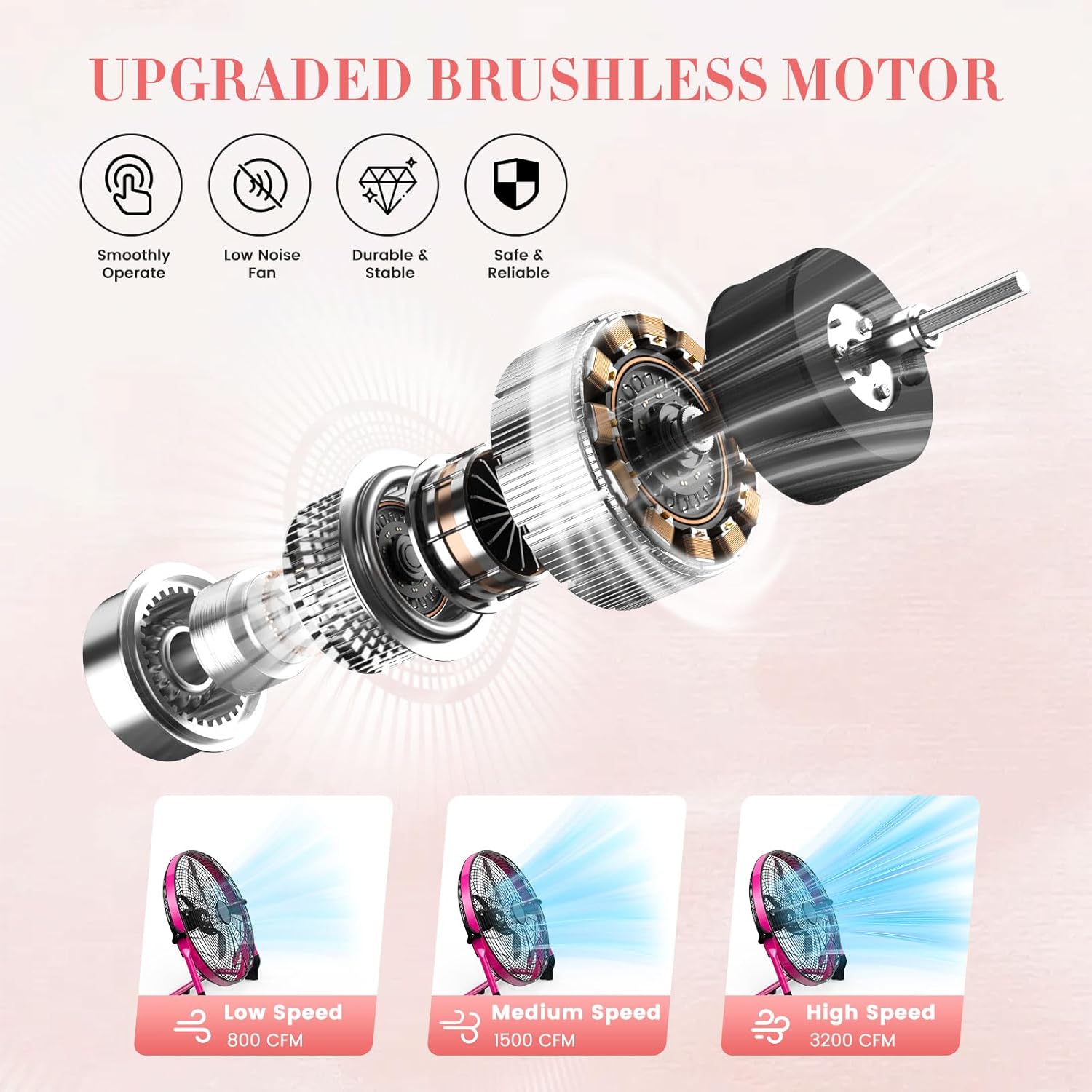 【3200 CFM Strong Airflow, Whisper-Quiet Operation】Experience powerful cooling without the noise! This hi-velocity portable fan delivers a maximum 3200 CFM air volume, while the pure copper brushless motor and ultra-thin metal blades ensure quiet performance. Use the quiet fan indoors (bedroom, living room, attic, bathroom) or in RVs/cars—enjoy cool breezes without disrupting rest or conversations