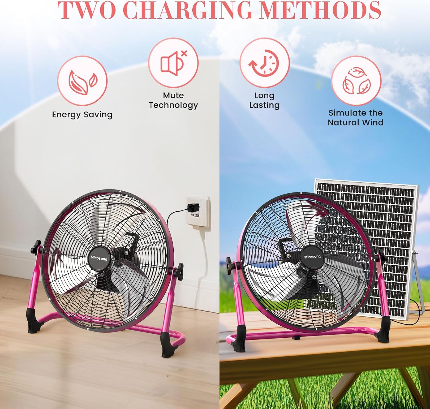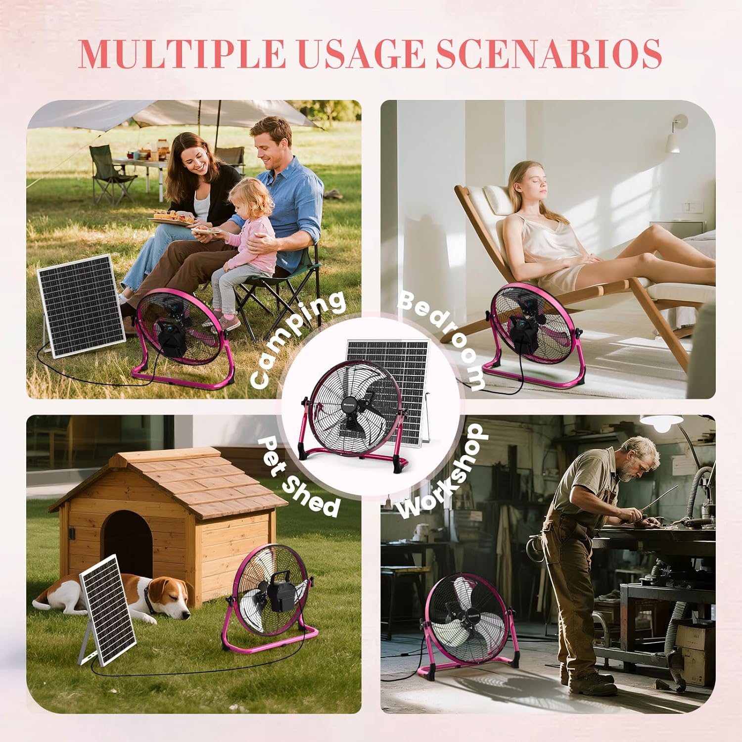 【40W Solar & AC Dual Charging for Instant Readiness】This solar powered fan eliminates two charging efficient options. Use the included AC adapter for a full charge in 3 hours, great for indoor setups like garages or workshops. Outdoors, the high-performance monocrystalline solar panel gets it fully powered in 4-6 hours, making it a must-have for greenhouses, camping, tents, patios, barns, and even travel or barbecue trips.